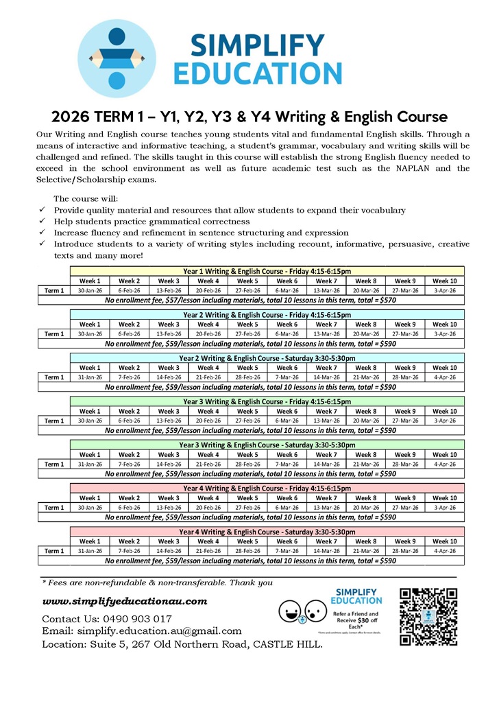 The class will typically begin with a focused writing theory topic which will involve in-class discussion and writing exercises. Students will be guided through the booklet with the expert guidance of our teachers who will provide opportunities for students to contribute and share ideas.