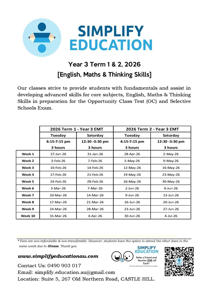 The Y3 EMT course is an accelerated development program for Year 3 students to strengthen their foundations in English, Mathematics and Thinking Skills for the Opportunity Class entrance exams.