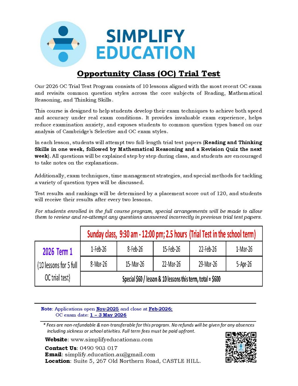 Students will sit a complete OC Exam (100 Questions over 3 papers) – Mathematics, Reading and Thinking Skills. The papers are developed based off the most recent OC exams, with a large variety of question types to give students a broad exposure to different questions.